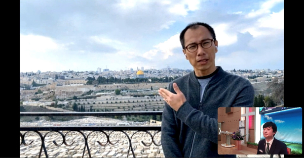 지난해 11월 말 대전 새하늘성결교회에서 열린 온라인 성지순례에서 채완병 예루살렘교회 목사가 이스라엘 감람산에서 예루살렘 성을 보며 설명하고 있다. 작은 사진은 새하늘성결교회에서 채 목사와 영상통화를 하는 윤영천 선교사의 모습. 예루살렘교회 제공