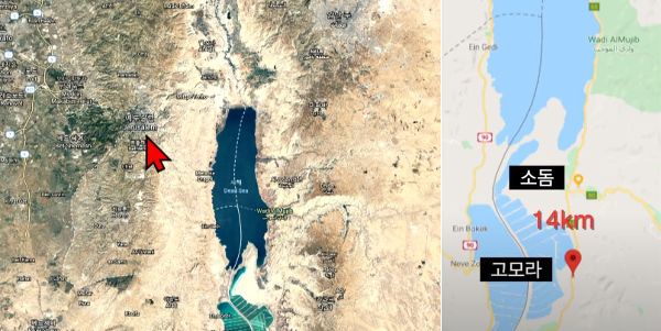 이스라엘 지도와 성경에 나온 소돔·고모라 지역의 지도(왼쪽부터). 유튜브 캡처